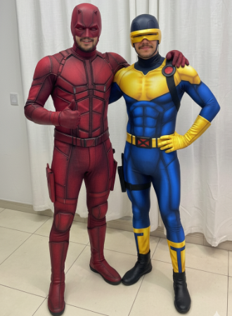 Caracterização obrigatória mínima: Um (a) charadista caracterizado como Demolidor (roupa, botas e máscara, todas as peças na cor vermelha). E um (a) charadista caracterizado como Ciclope (roupa azul e amarela, cinto, botas pretas e capacete).