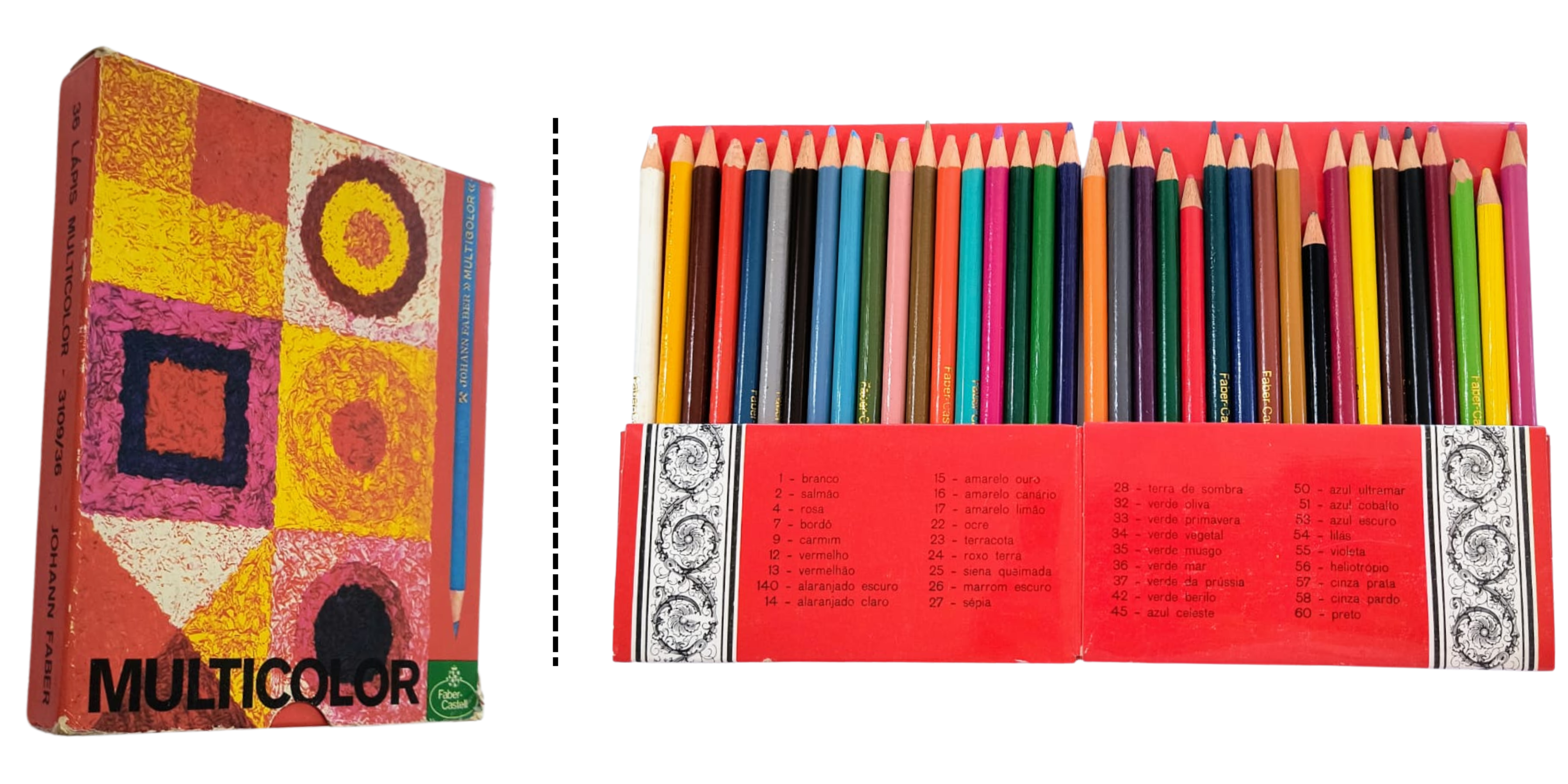 Entre os produtos mais icônicos estava a Caixa Multicolor de 36 cores, um objeto de desejo para estudantes e artistas mirins.
